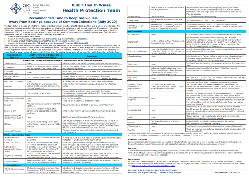Schools in North Wales refer to the guidance below from the Health Protection Agency. The guidance gives clear recommended periods of time that pupils should be kept away from school when suffering from medical conditions. Parents will find this information useful when considering if their child should attend school or how long to keep them off school for when they are poorly.